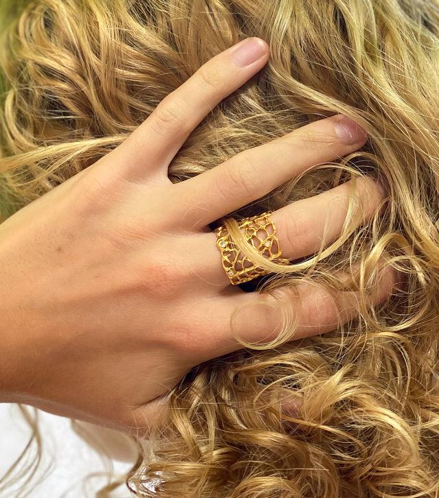 A delicate yet powerful statement, this ring has a lace like form which wraps elegantly around the finger, it’s infinite design offering multiple viewpoints.