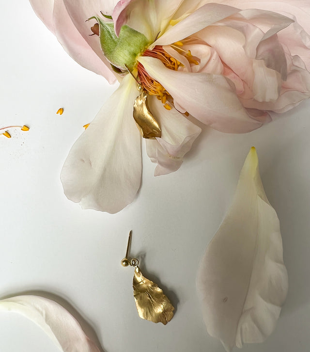 The story begins with real rose petals, handpicked for their individual beauty and character. Each one is then captured forever in gold using the ancient process of lost wax casting. Imperfections and subtle variations in shape and form become a celebrated part of the aesthetic.