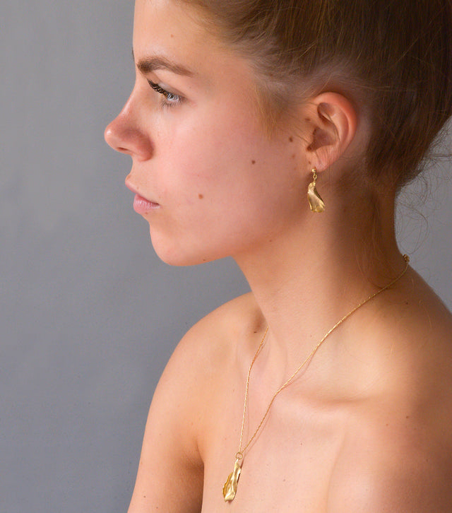 This set includes two different petals, each chosen to enhance the other. Cast in 18ct gold and suspended from a bead and ring, these earrings have a semi polished finish.