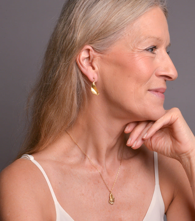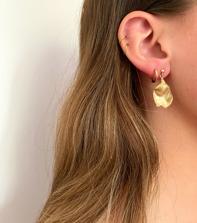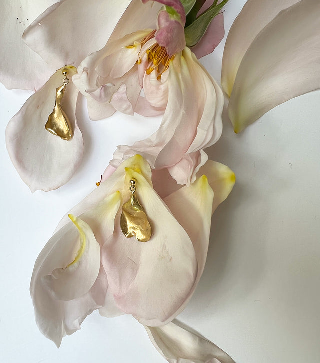This set includes two different petals, each chosen to enhance the other. Cast in 18ct gold and suspended from a bead and ring, these earrings have a semi polished finish.