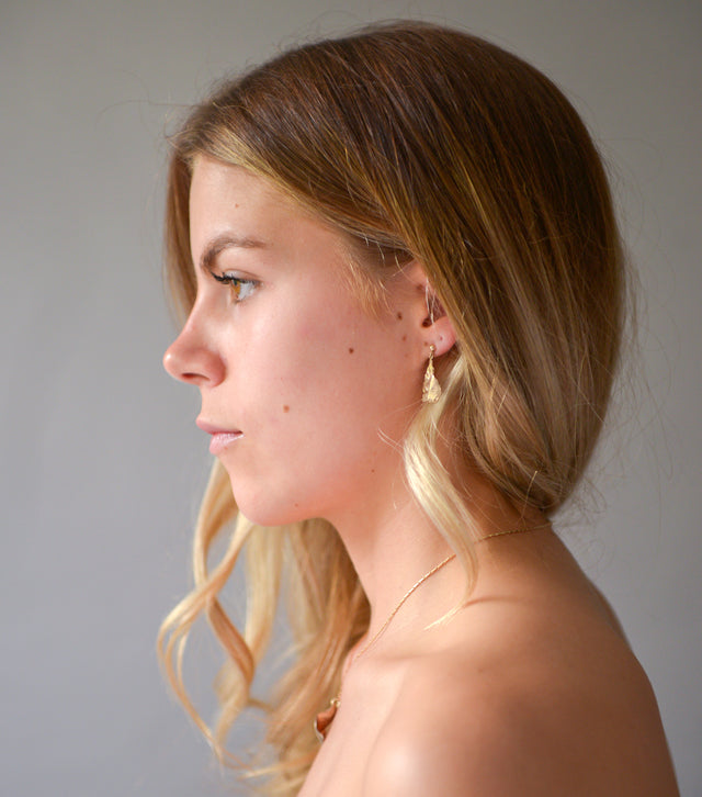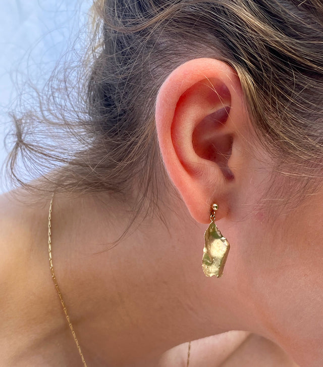 This set includes two different petals, each chosen to enhance the other. Cast in 9ct gold and suspended from a bead and ring, these earrings have a semi polished finish.