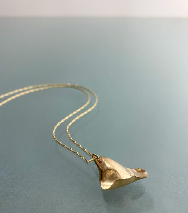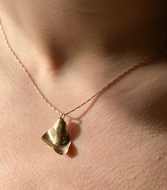 This one of a kind necklace features a single 9ct gold rose petal with a semi polished finish, suspended on a 40cm textured chain. Exquisite from every angle, this piece has been hallmarked discreetly so that you can display your petal whichever way you choose.